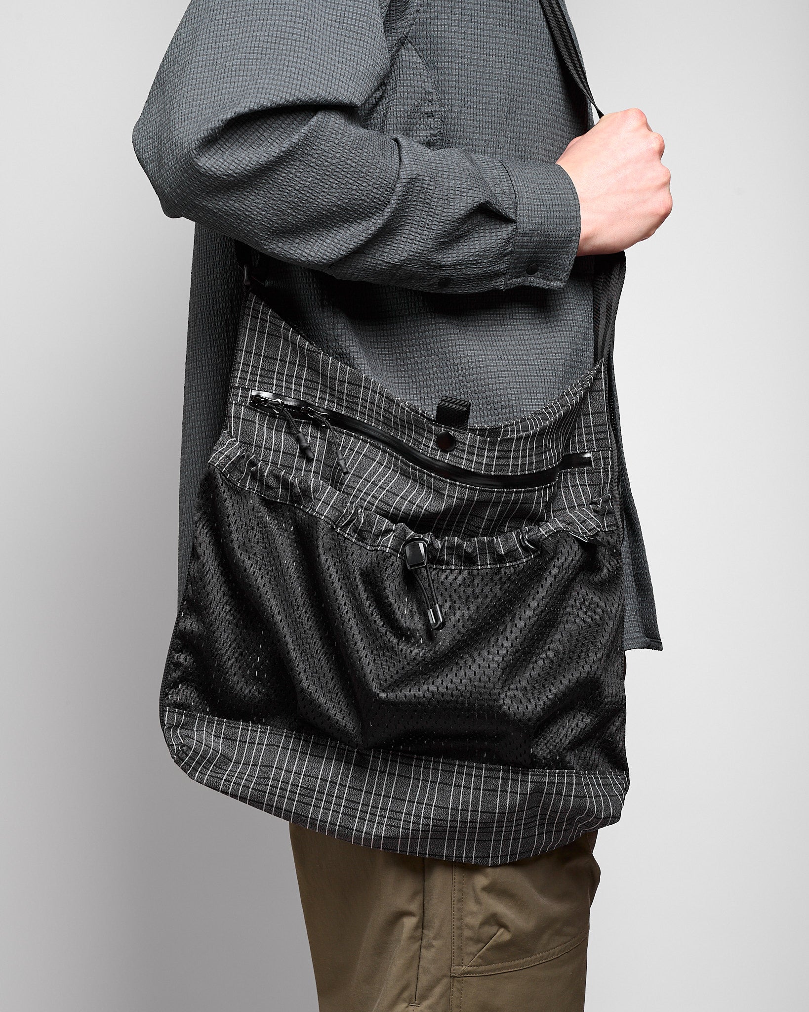 A smooth and stretchy crossbody sling from CAYL. It's anchored by a wide webbing strap and features lots of practical storage options. Plus, it comes in a unique check pattern—can't go wrong with that!