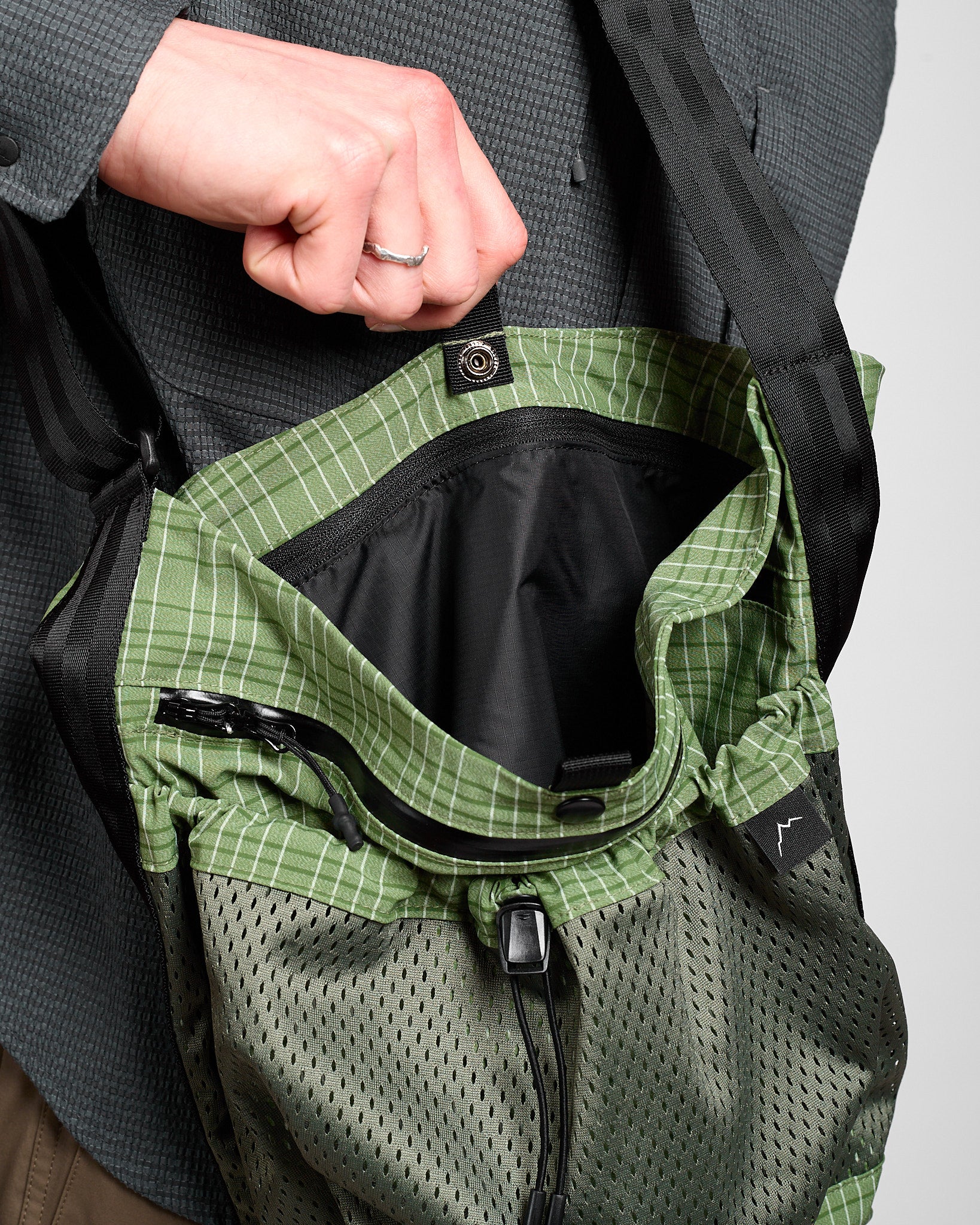 - Two exterior pockets: one outer mesh with a cinch adjustment, and a waterproof zippered one