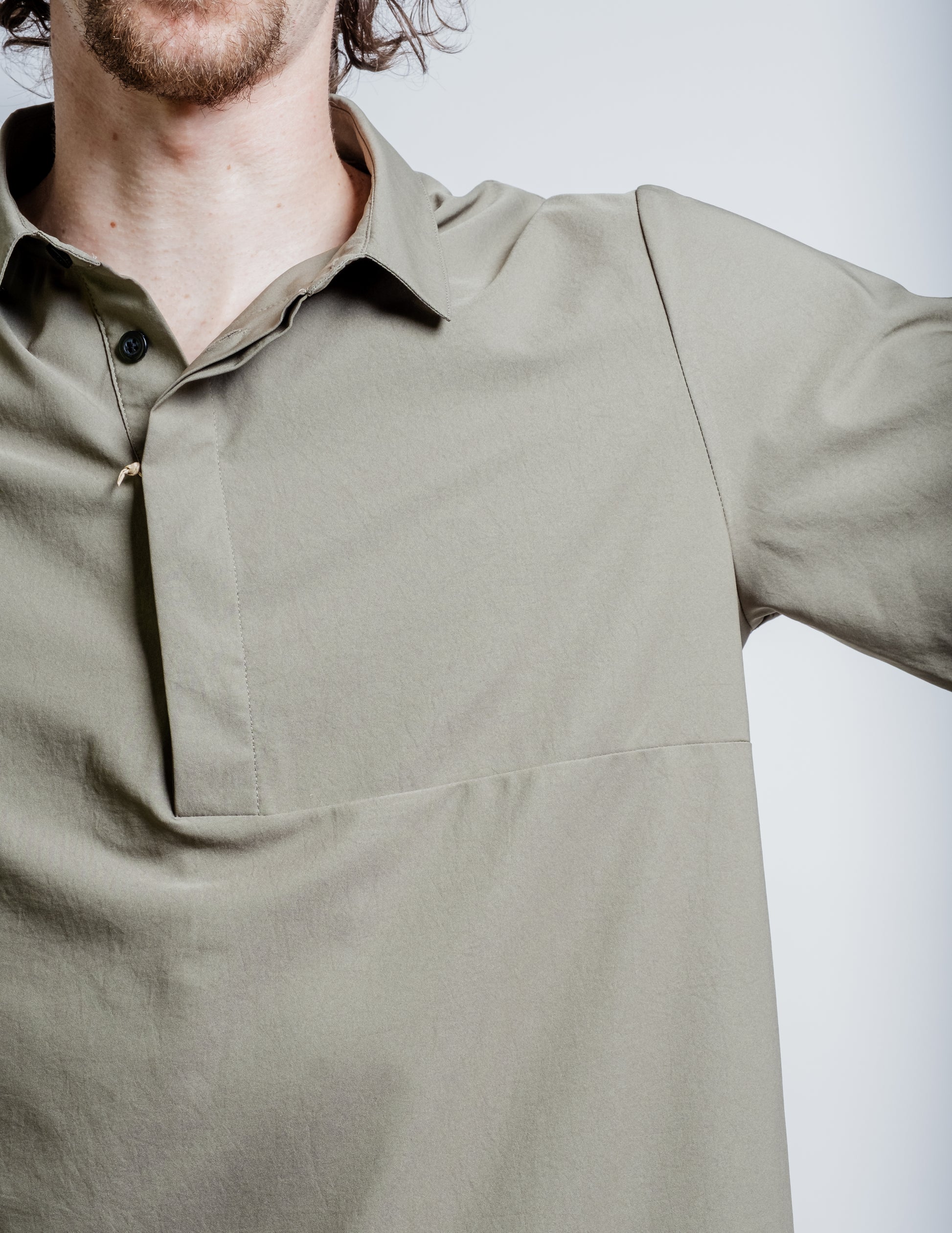 - Asymmetric paneling at chest and multiple buttons