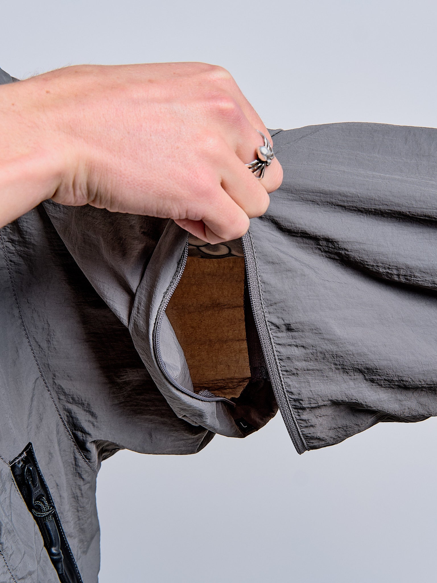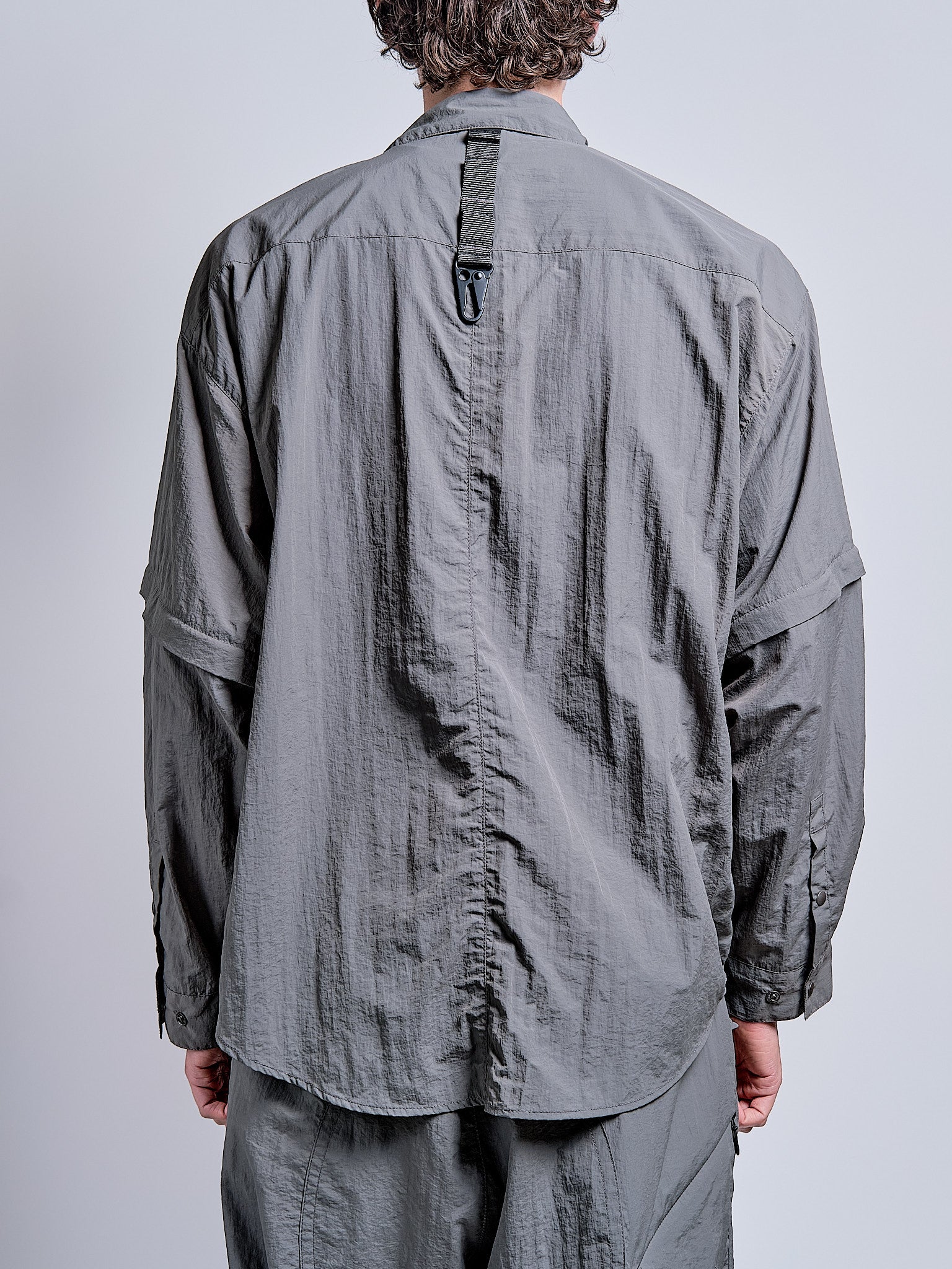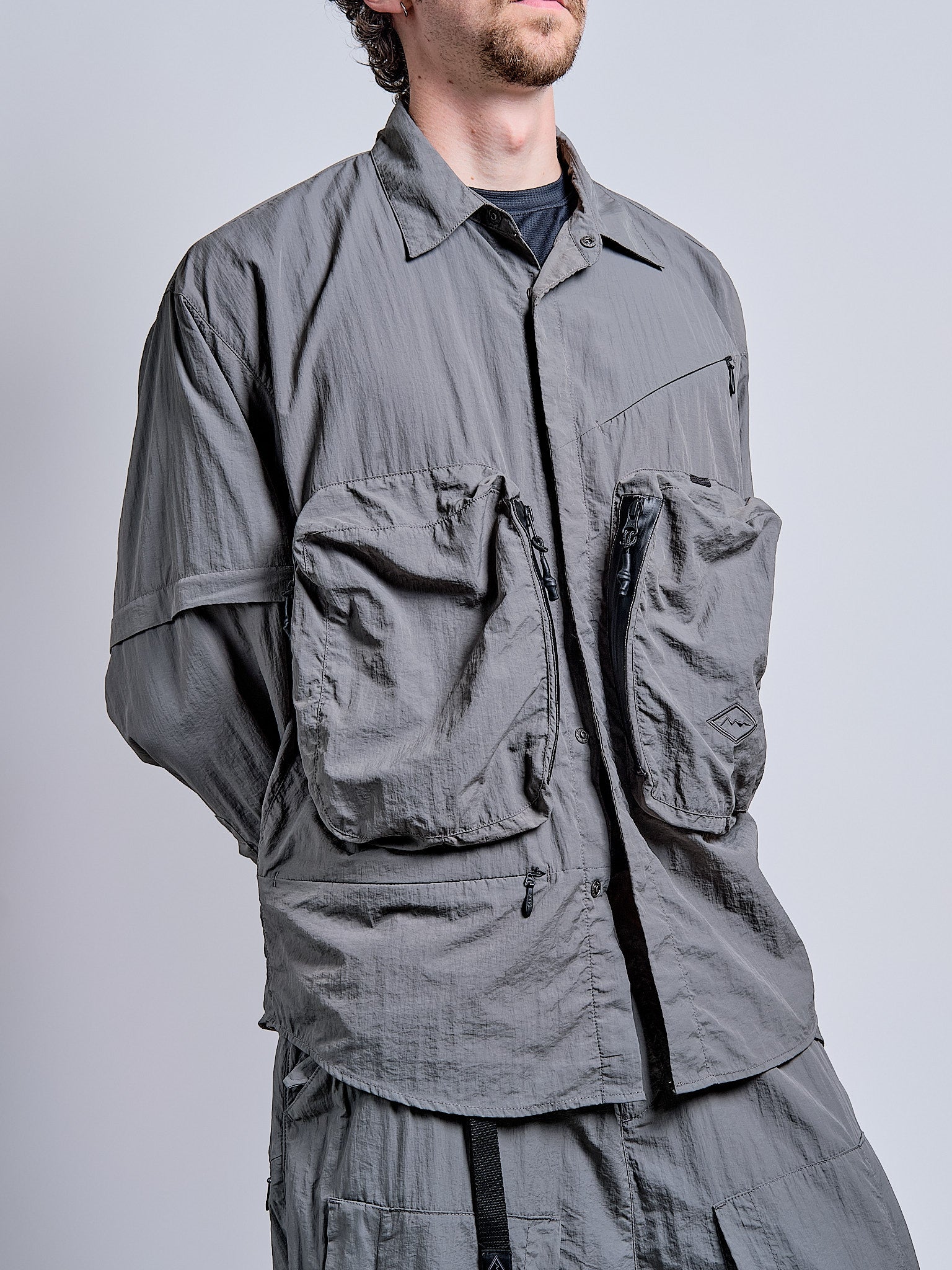 A loose buttoned shirt cut from a bouncy nylon. Manastash's "Extra Mile" line contains their most technically sophisticated styles, loaded with cool details and unique fabrics. This shirt fits the mold, with two humongous front pockets, numerous zippers and a lovely snap button closure.