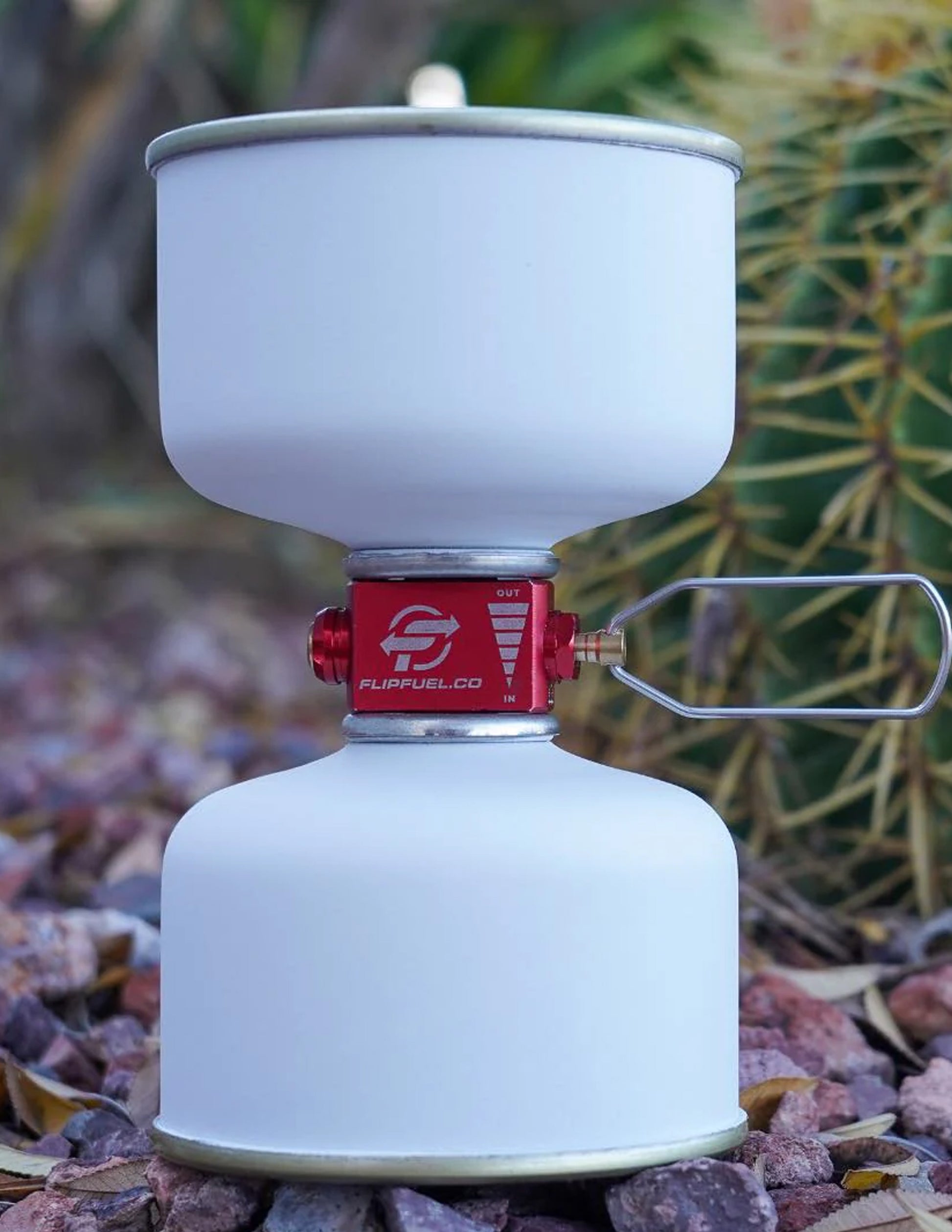 FlipFuel® is a device that transfers leftover isobutane fuel from one partially filled canister to another. Use FlipFuel® to consolidate fuel into one canister so that you can carry a full canister and recycle the empties!