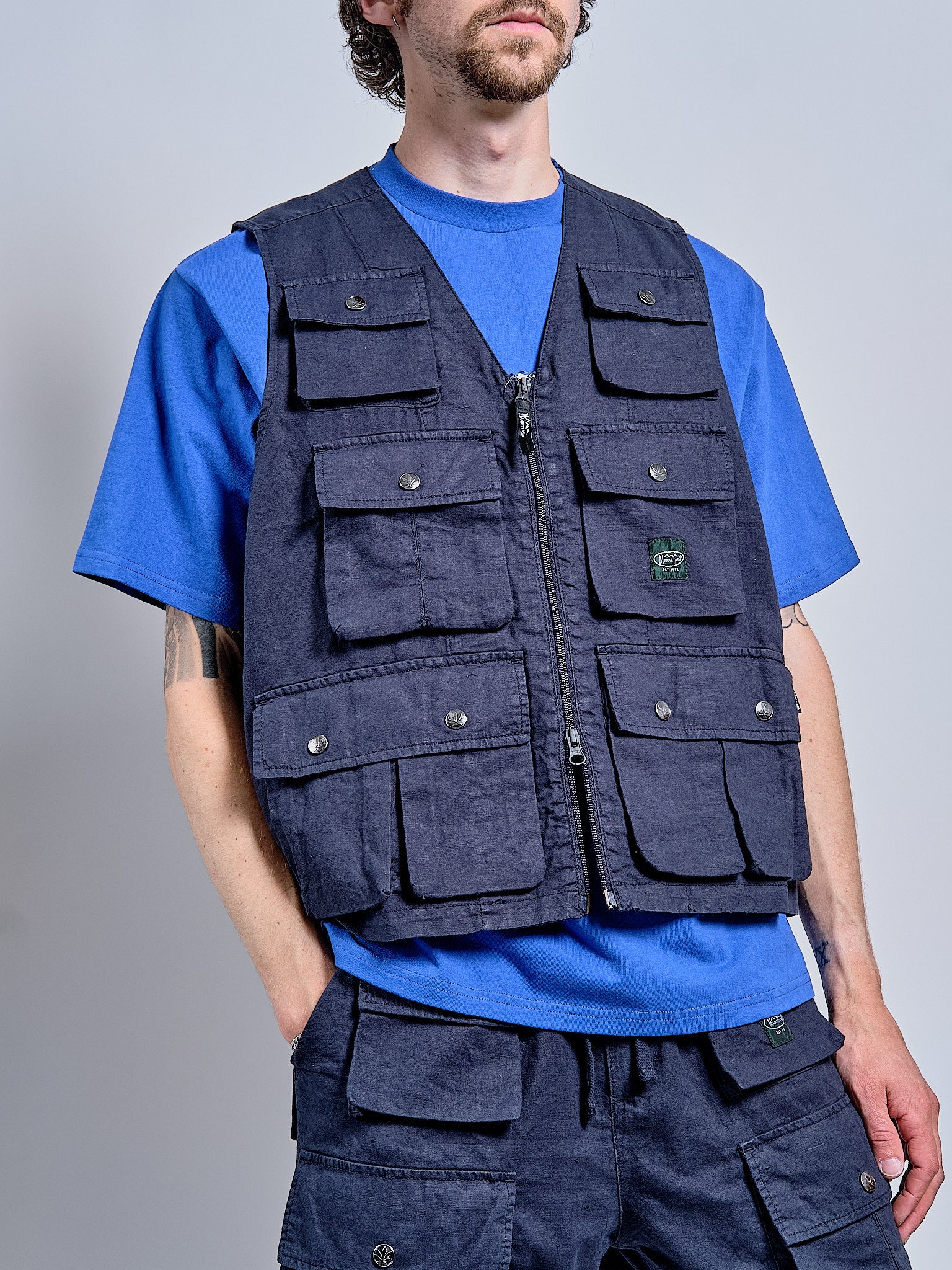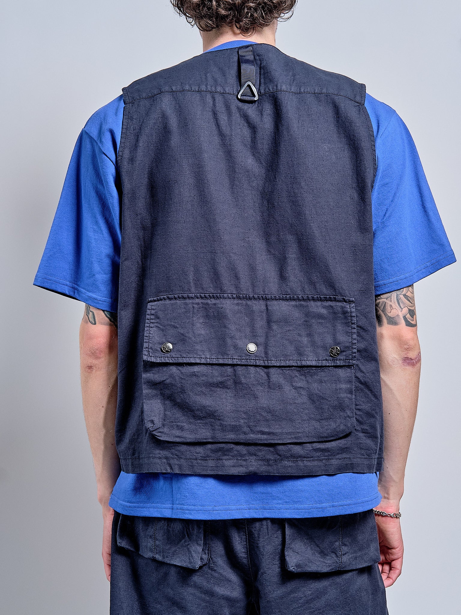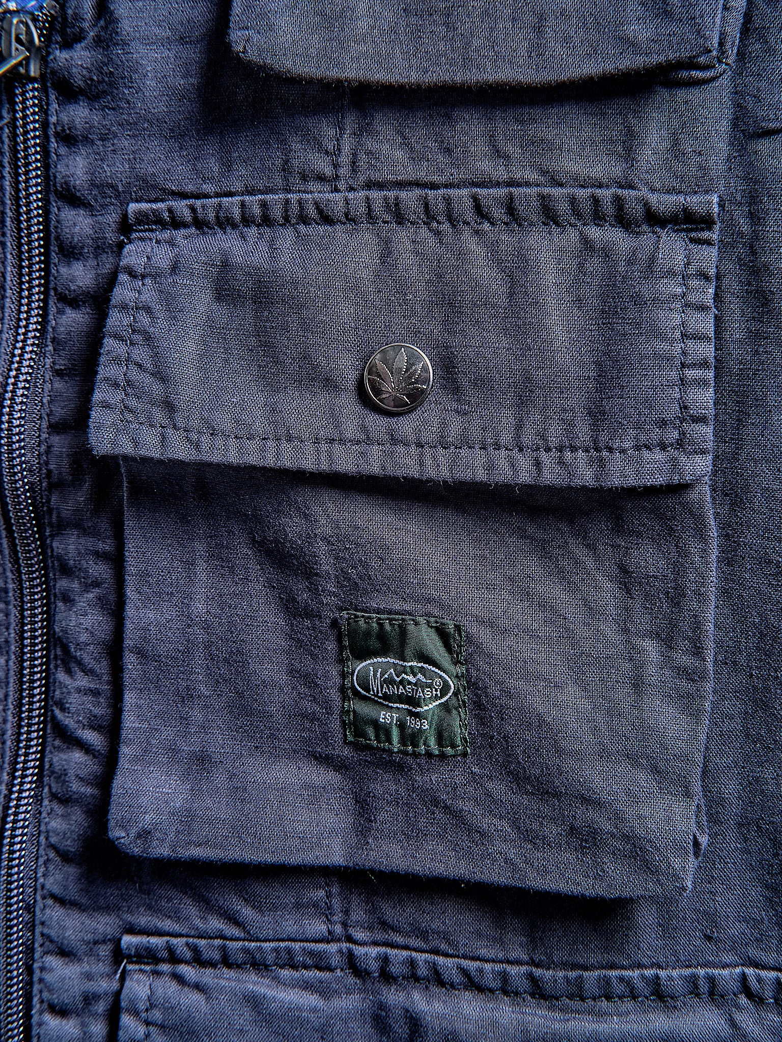 We heard you like pockets...this vest has lots of pockets. Made of a hemp blend fabric and dyed a rich, deep navy, this is perfect over a tee or something burlier. Never use a bag again.