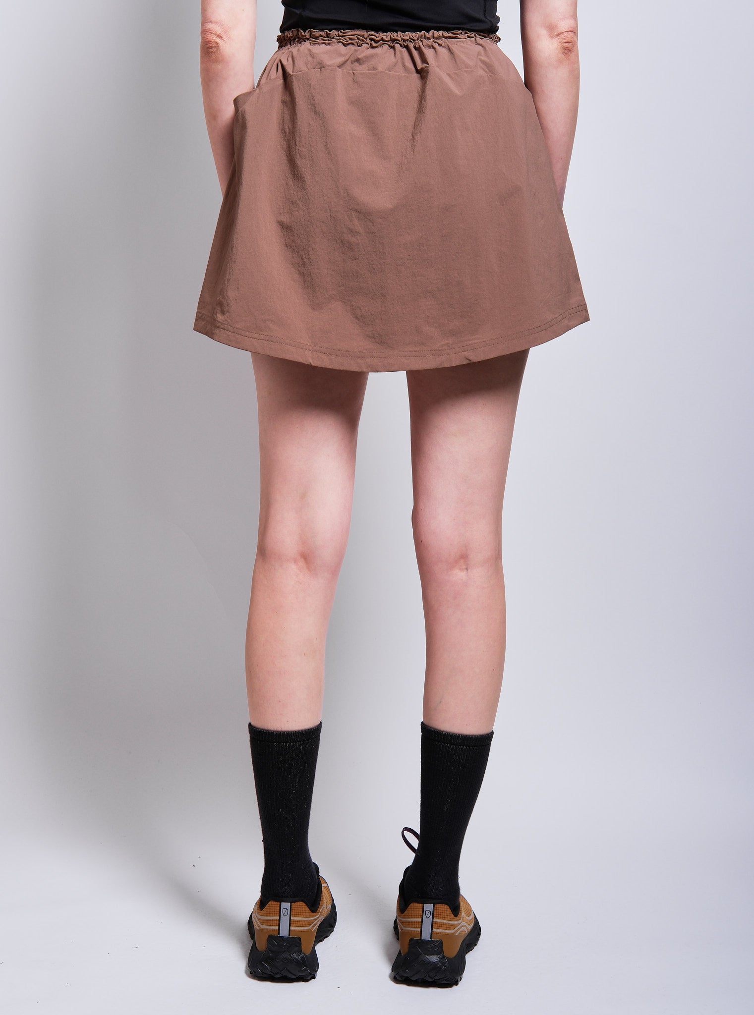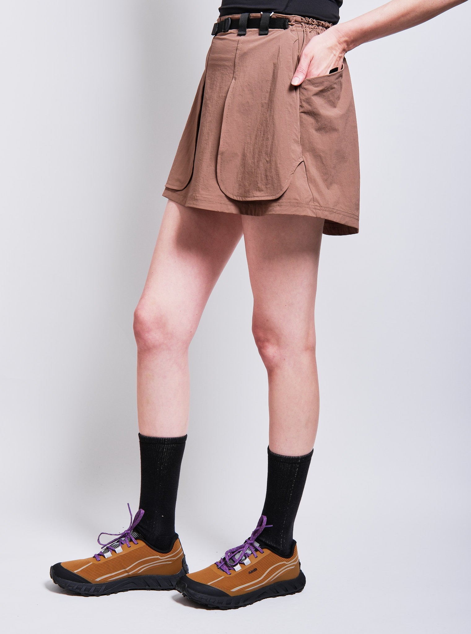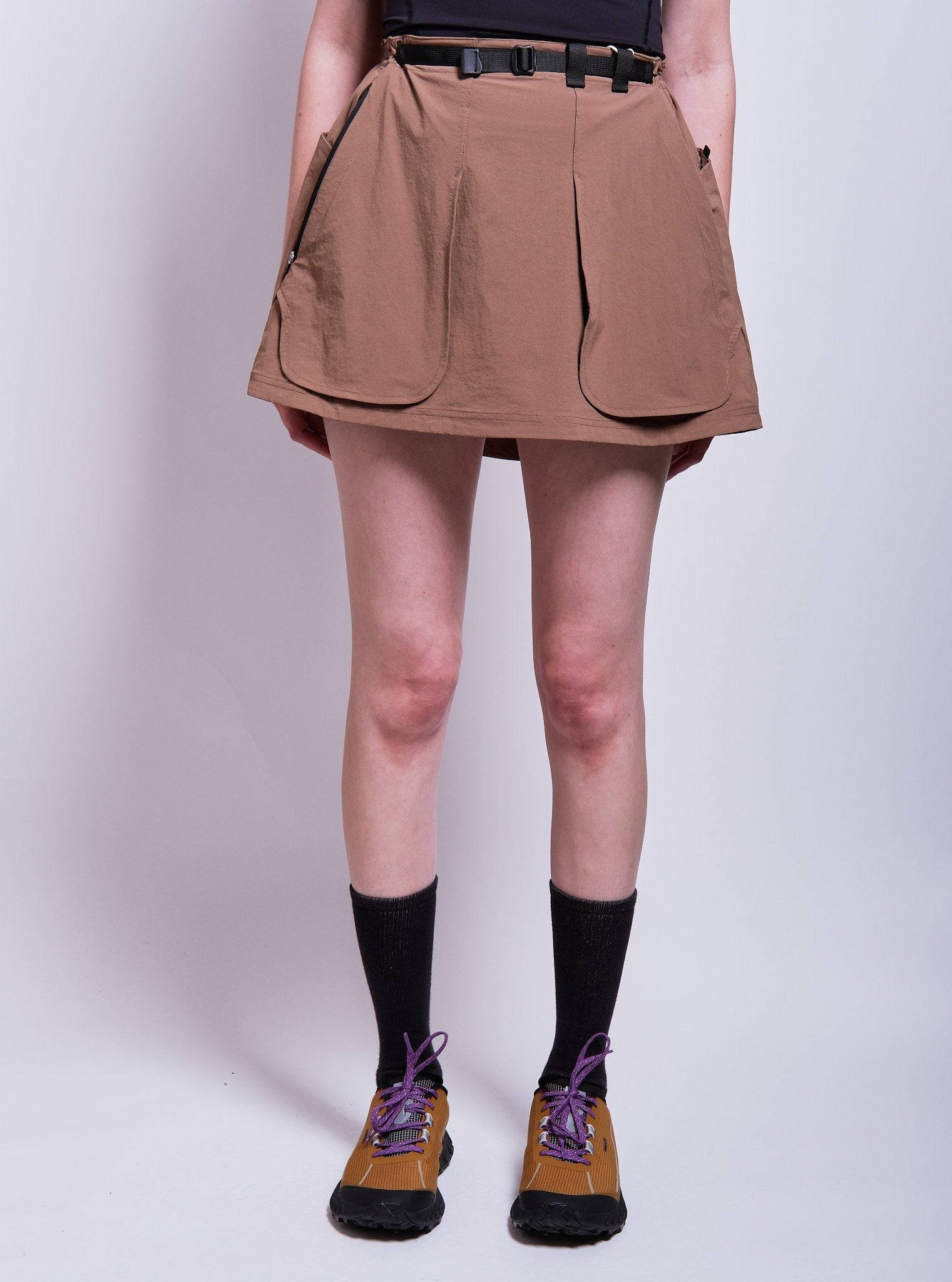 Have you seen a cargo-skirt? This stylish hiking companion is constructed from a durable stretch woven fabric. It features two zippered 3d pockets and two snap-closure back pockets. It's elastic waistband features an adjustable belt