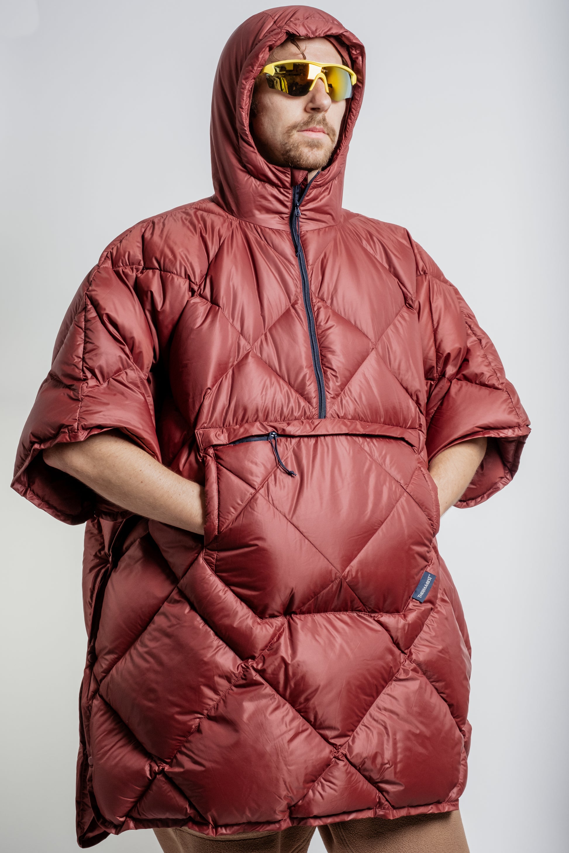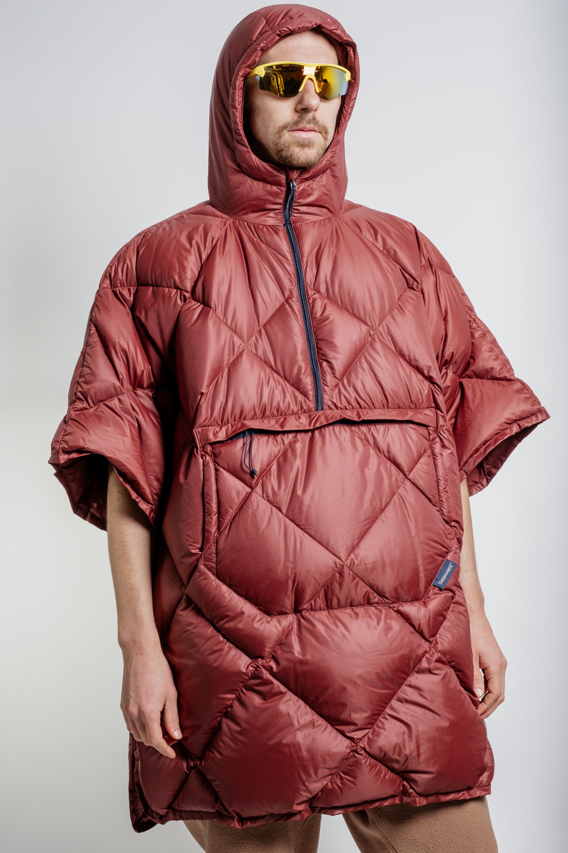A packable, down-insulated hooded poncho from Thermarest. It's perfect for wearing around the campfire or after surfing. It's shell and down interior or both DWR-treated for additional water-resistance. It features a half zip, a large hand-warming-zone and snap buttons on the sides for easy adjustability. Stuffs into its front pocket!