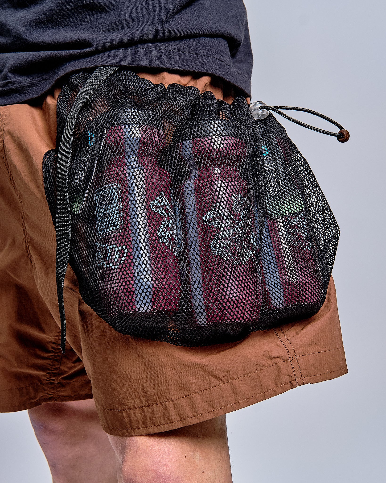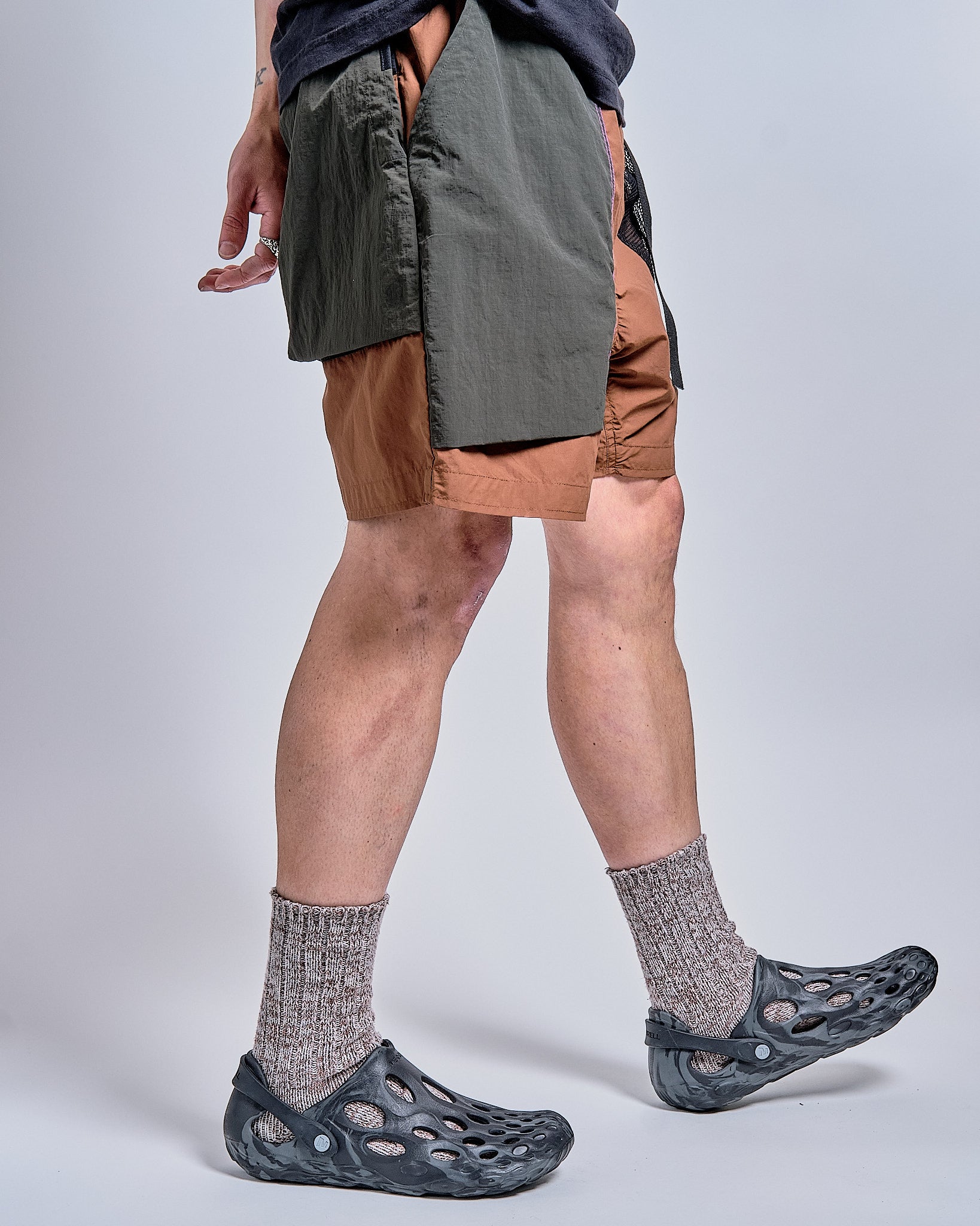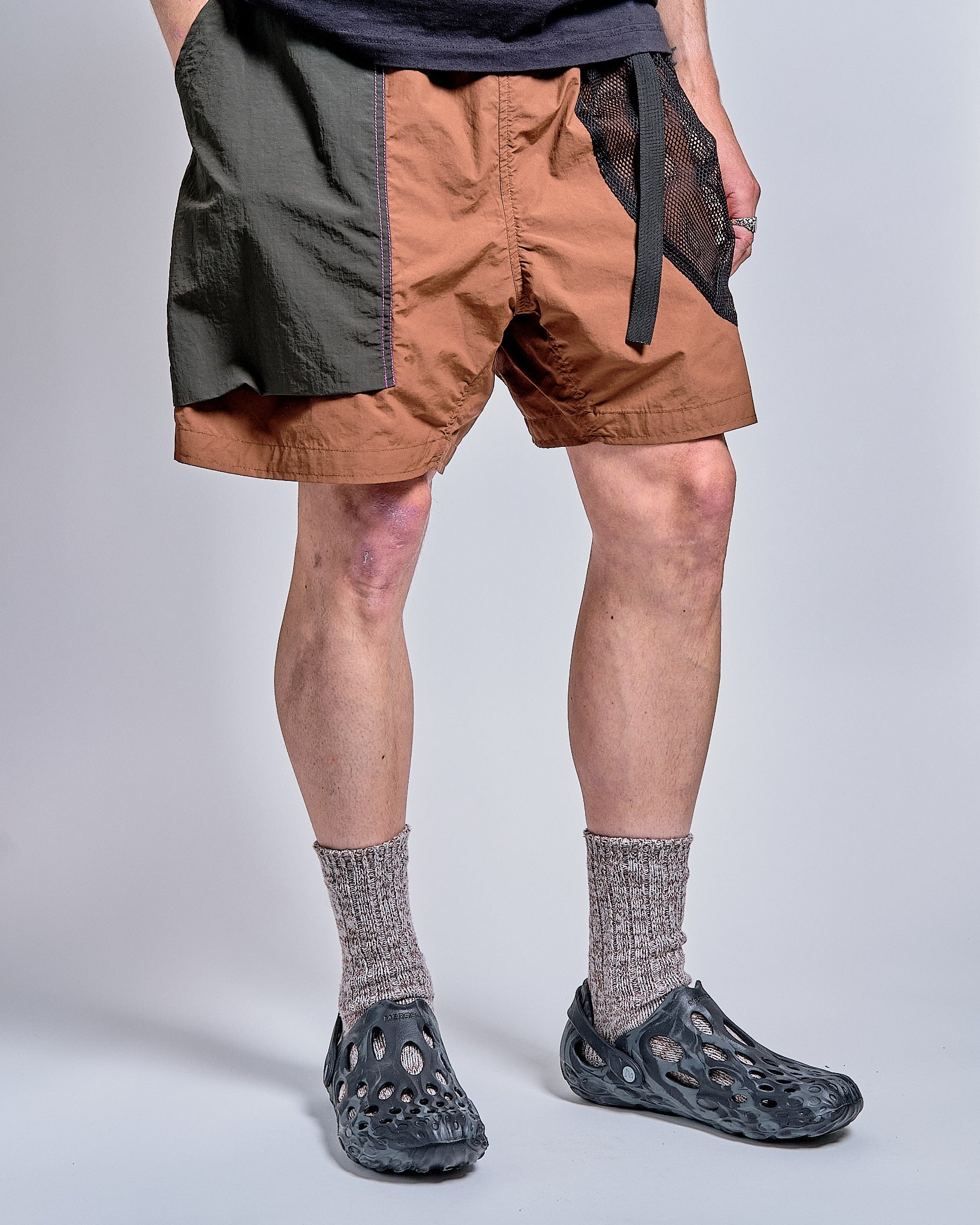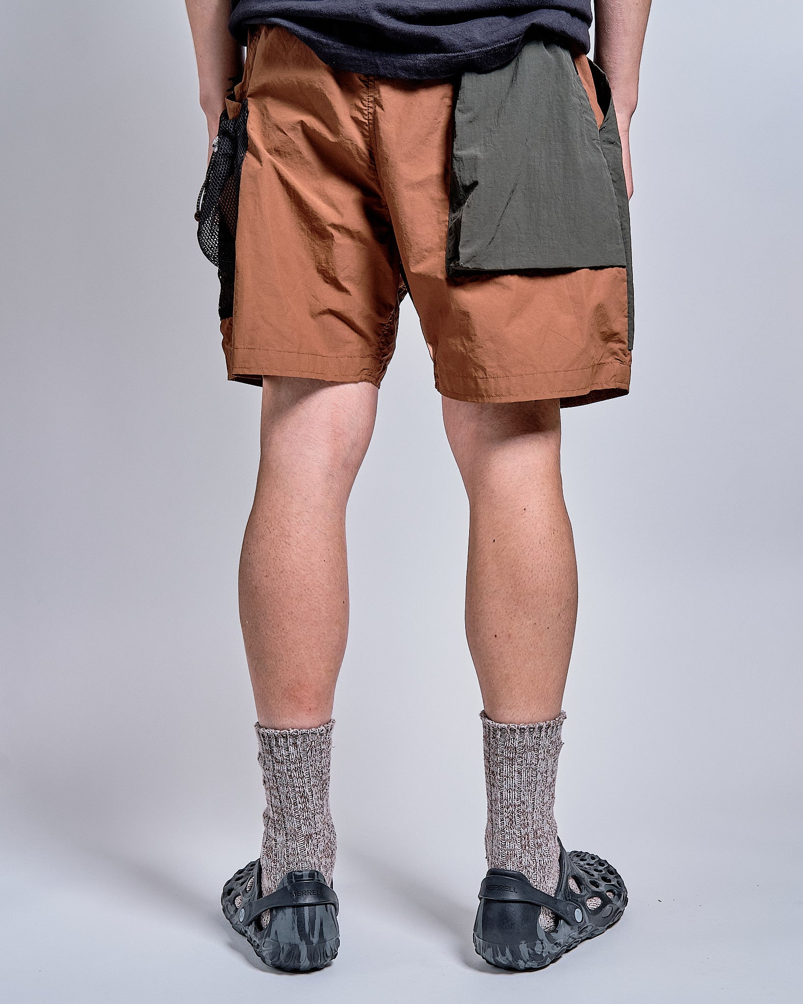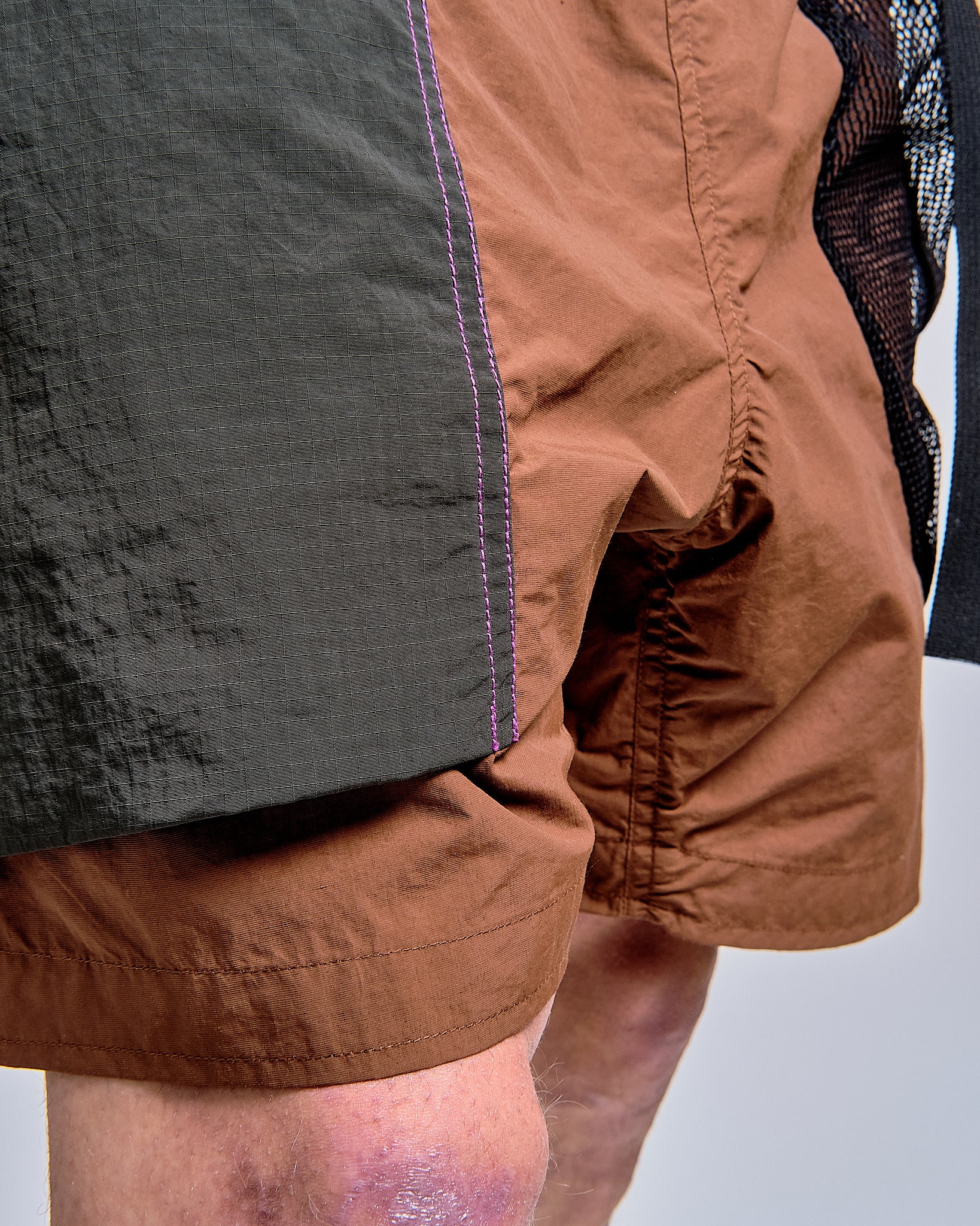 A breezy pair of shorts made from a lightweight and moisture-wicking nylon/cotton blend. Created in collaboration with Earth\Studies, these feature bold colorblocked ripstop pockets, magenta contrast stitching and unique graphic touches.