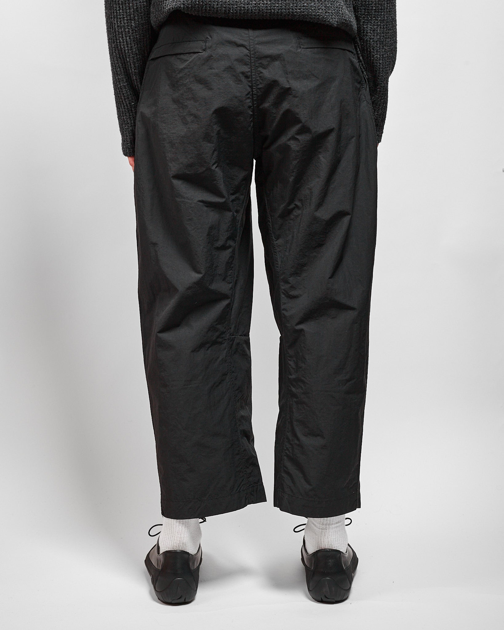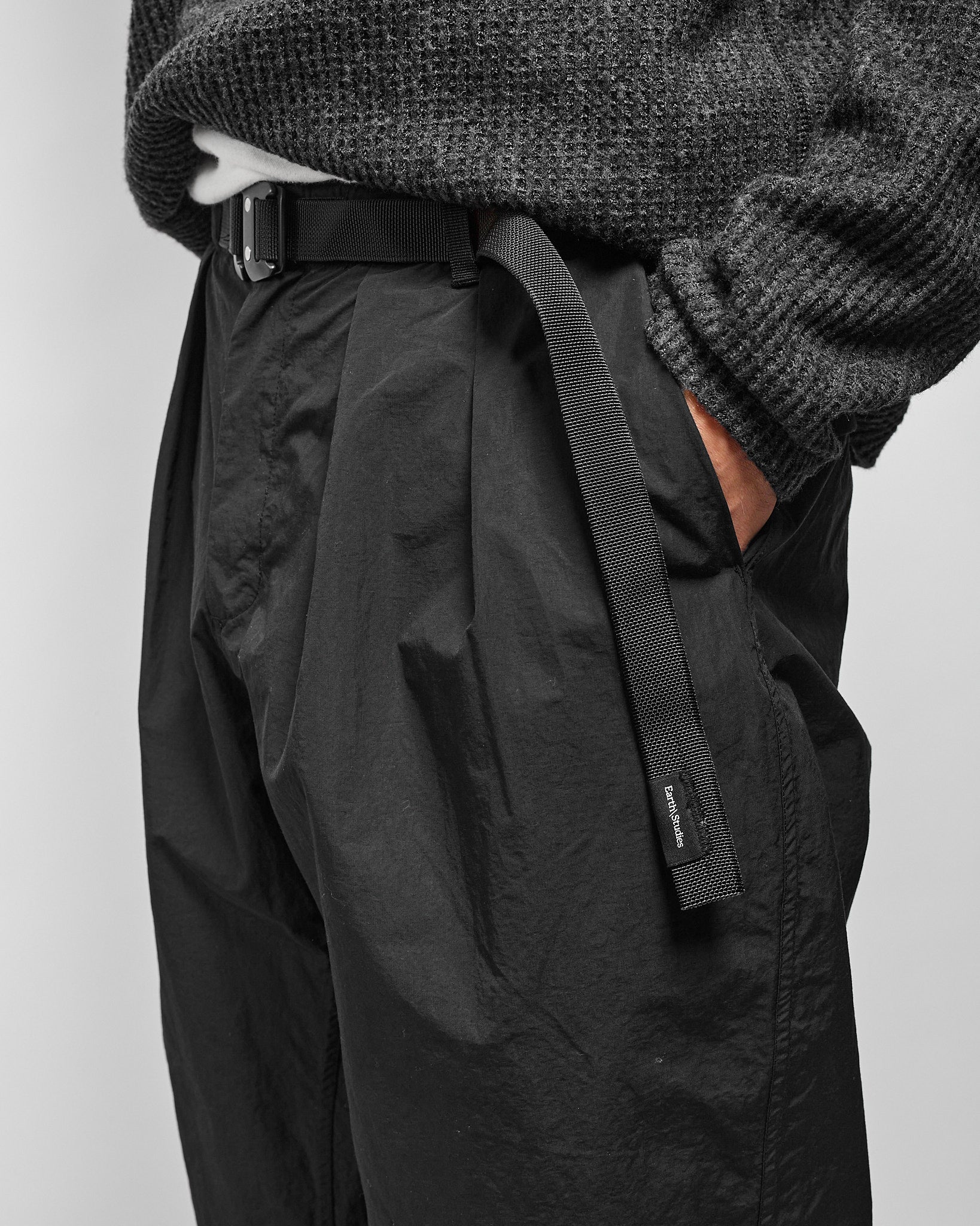 A high-volume pleated pant made from a dense and soft cotton/nylon blended fabric. They possess a bit of water repellency and can double as something fancier if need be.