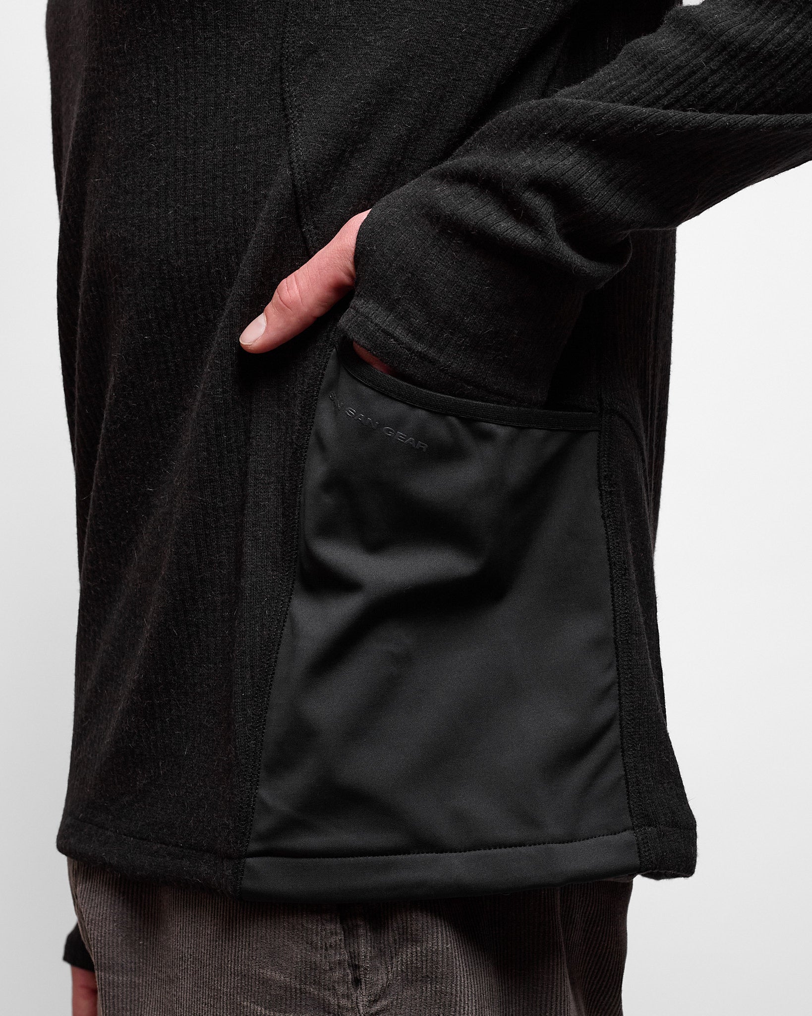 A smooth and warm ribbed longsleeve that's easy to wear on its own or layer with something else. It's got a few funky San San Gear twists, like a stretch drop pocket on its side and expanding zippers across the shoulder.