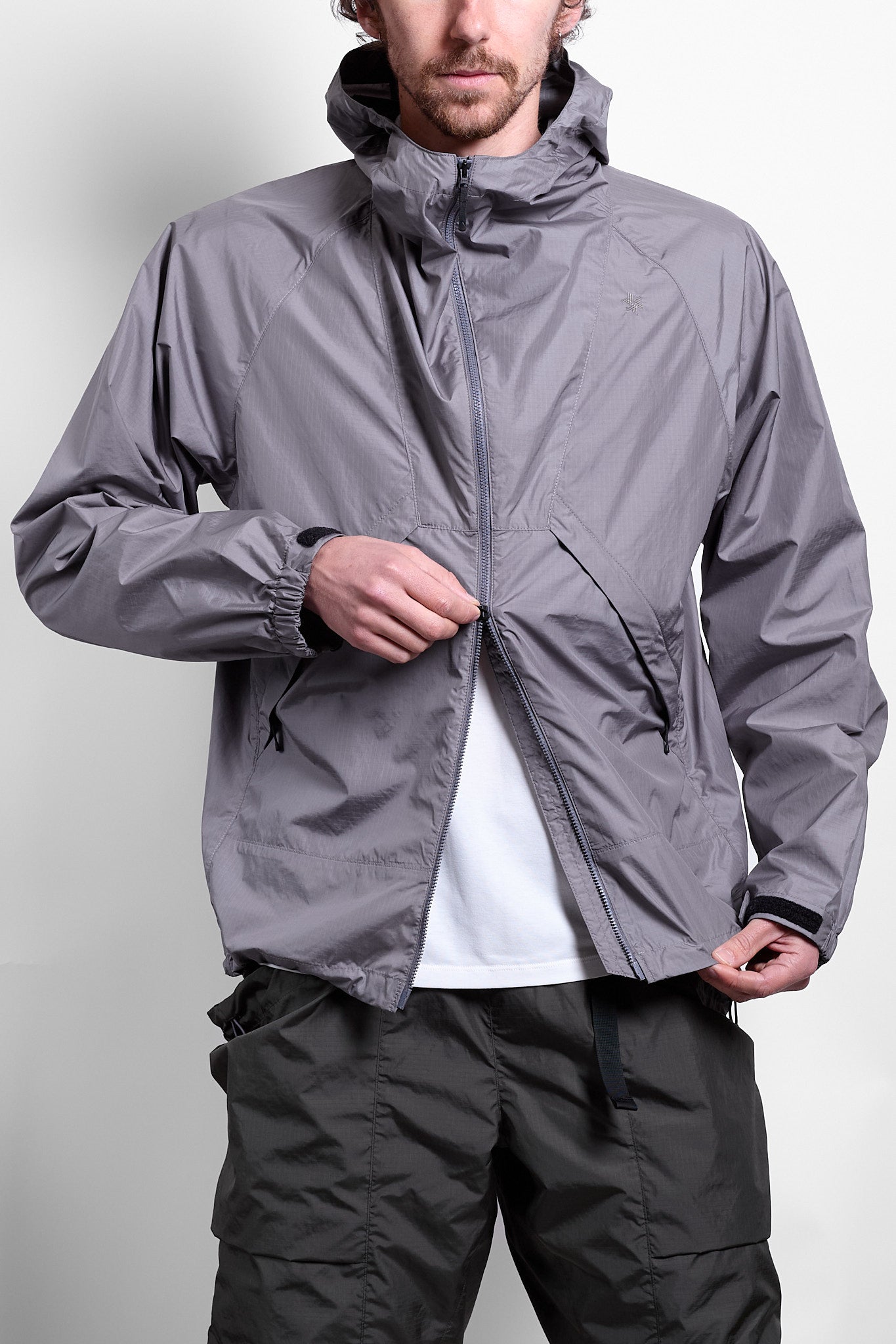 A super light wind jacket made from a Goldwin-engineered water-repellant ripstop. It dries quickly and provides the perfect amount of protection for the spring and summer months. And fall too, if we had to guess.
