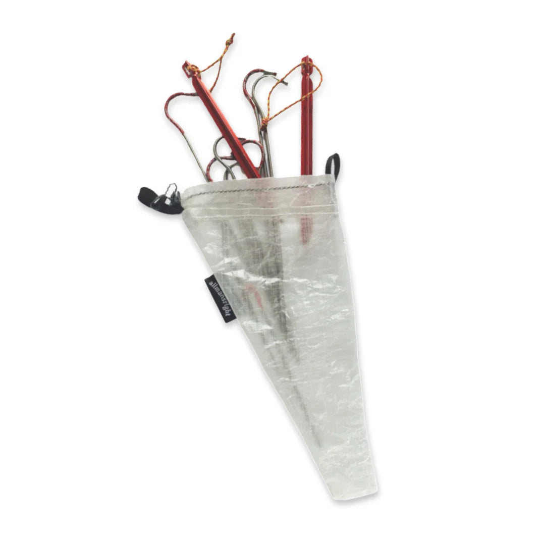 Made of durable Dyneema®, this stake bag sports a very wide opening and features pull tabs for hassle-free opening and closing. The draw-cord is also made with Dyneema® to support that feature. The seams are taped to keep stakes from easily poking through!