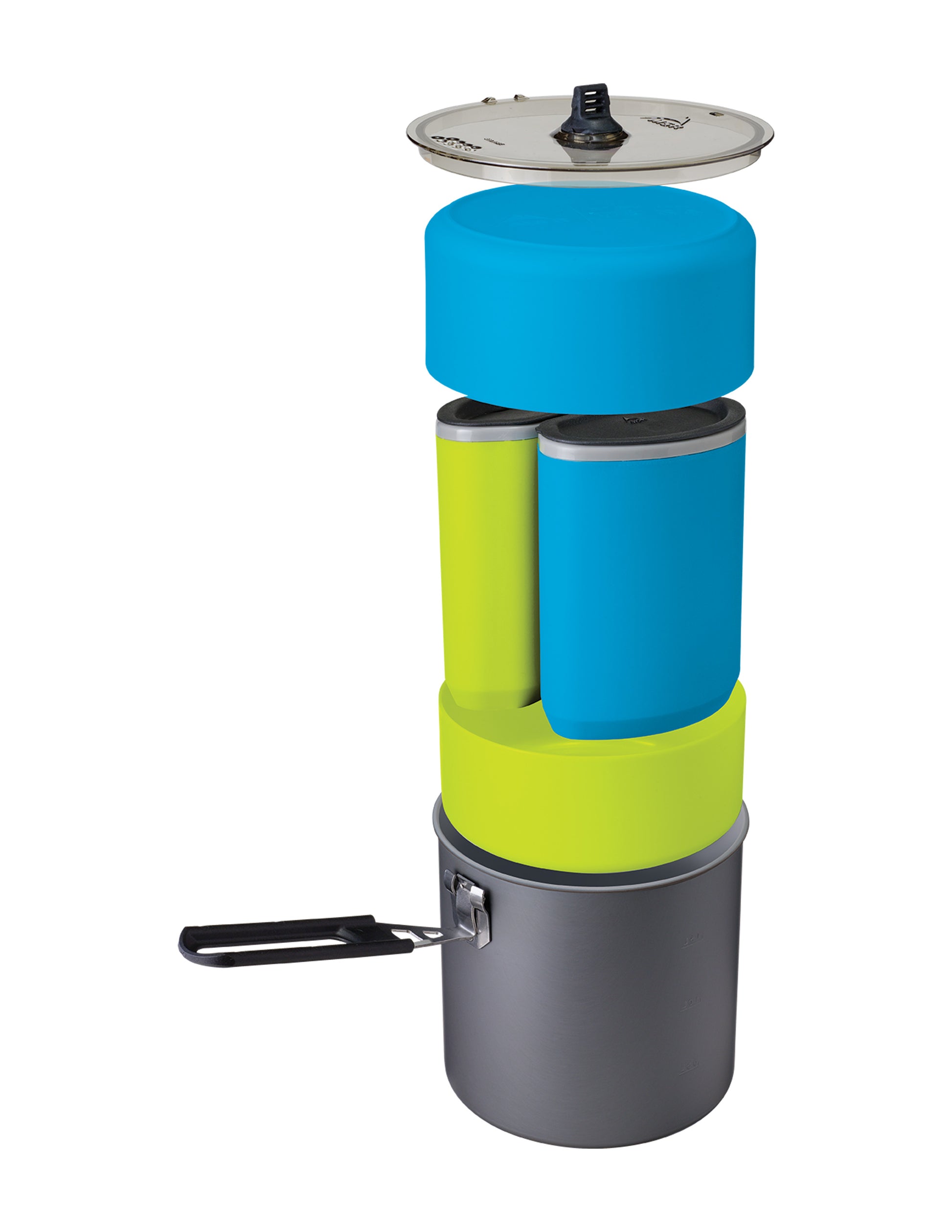 The Trail Lite Duo Cook Set delivers all the lightweight, space-saving benefits of a minimalist cook set, without forcing you to be Spartan about what you cook. The system features a tall 2 liter hard-anodized aluminum pot that accommodates two and keeps the menu options open. The dish set includes two color-coded MSR DeepDish™ Bowls and Insulated Mugs, which nest perfectly inside the pot for all-in-one packing convenience and space-maximizing efficiency. The folding, locking handle keeps it all in place inside your pack as you cover the miles.
