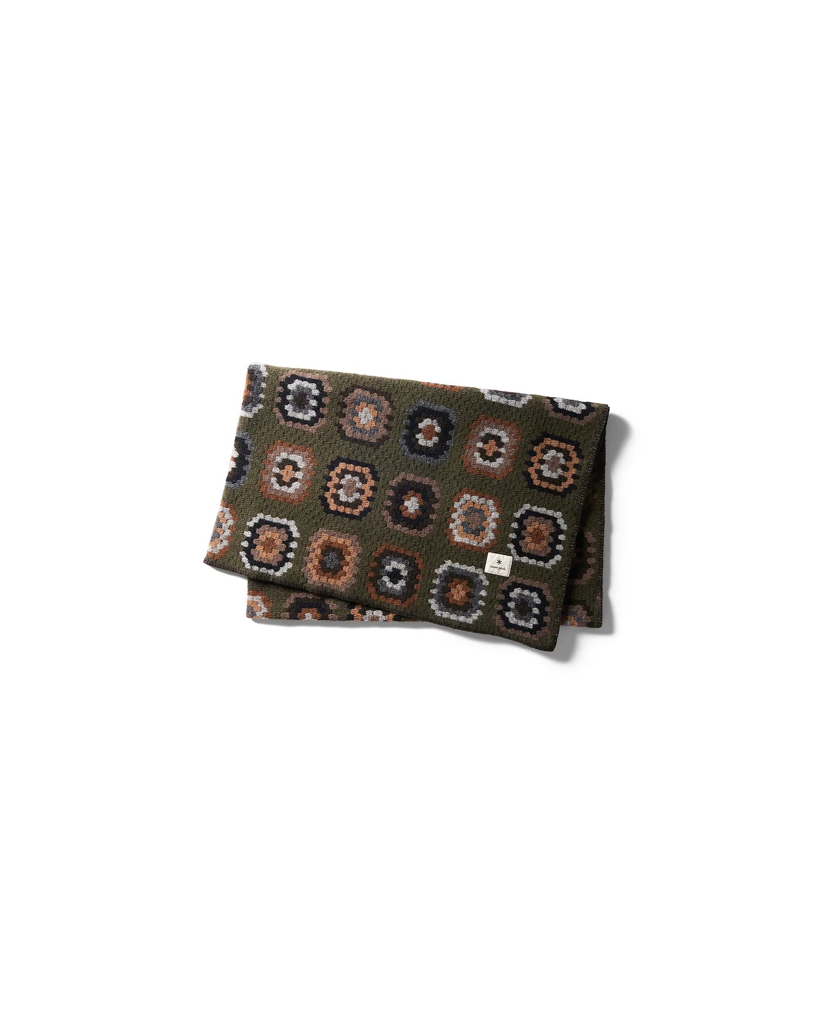This is a very think and cozy blanket, featuring a riff on a traditional jacquard pattern. It's woven with a wool/poly blend that is soft and enveloping—perfect for outdoor and indoor use.