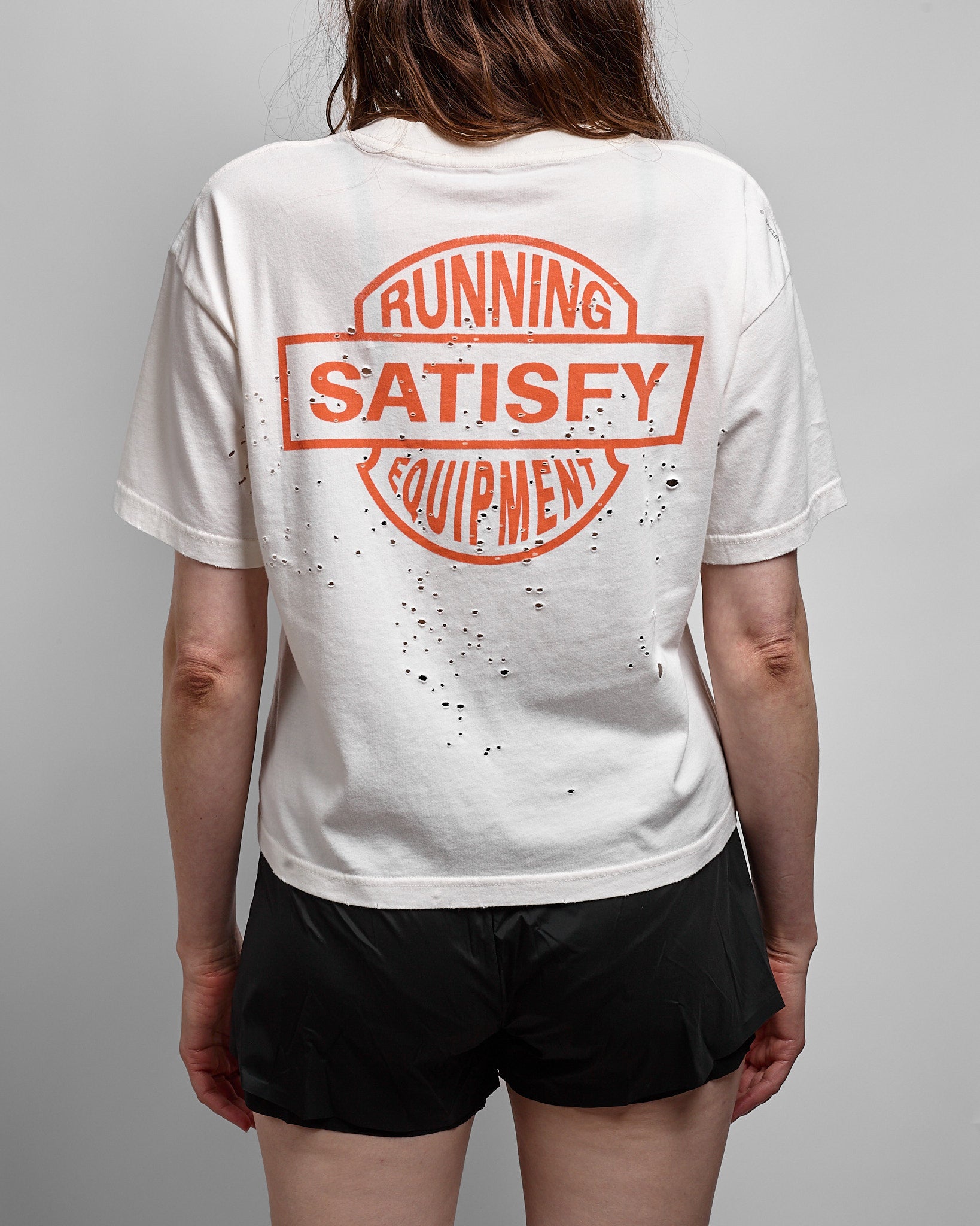 Satisfy's signature tee, now in a women's fit. It's constructed of a garment-dyed, heavily washed organic cotton and features Satisfy's signature MothTech™ perforations for increased airflow. Yes, it's okay to run in cotton.